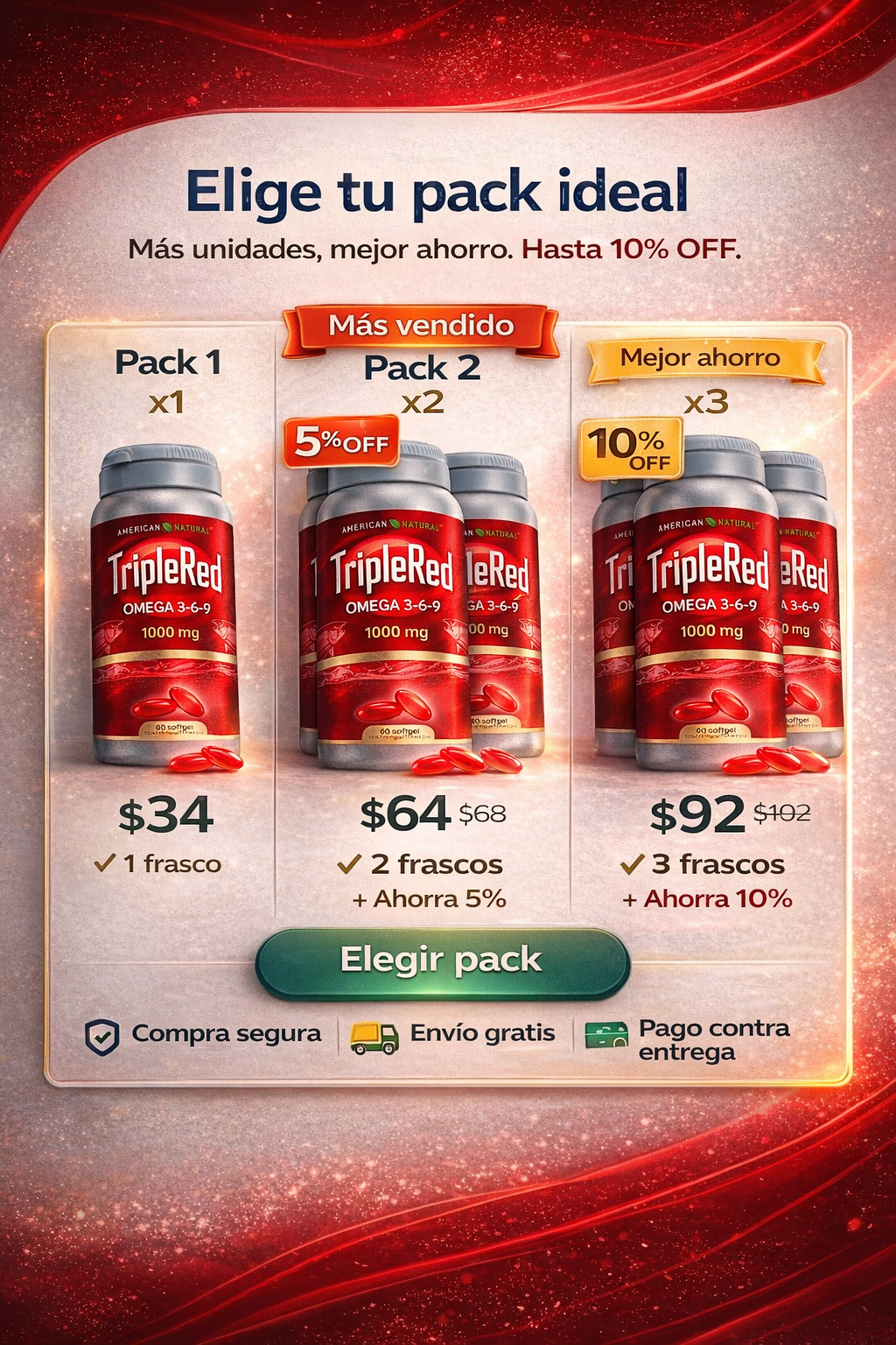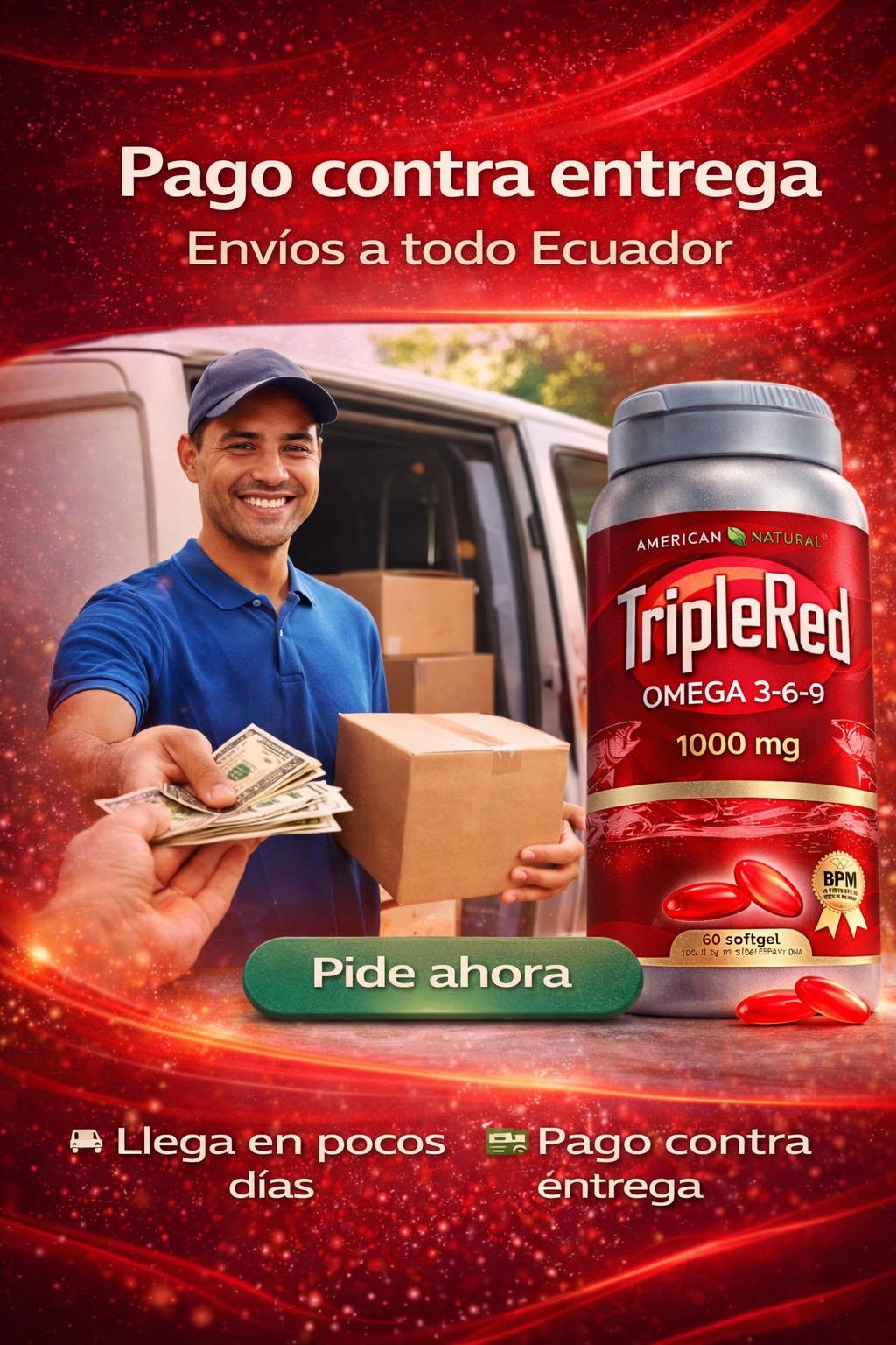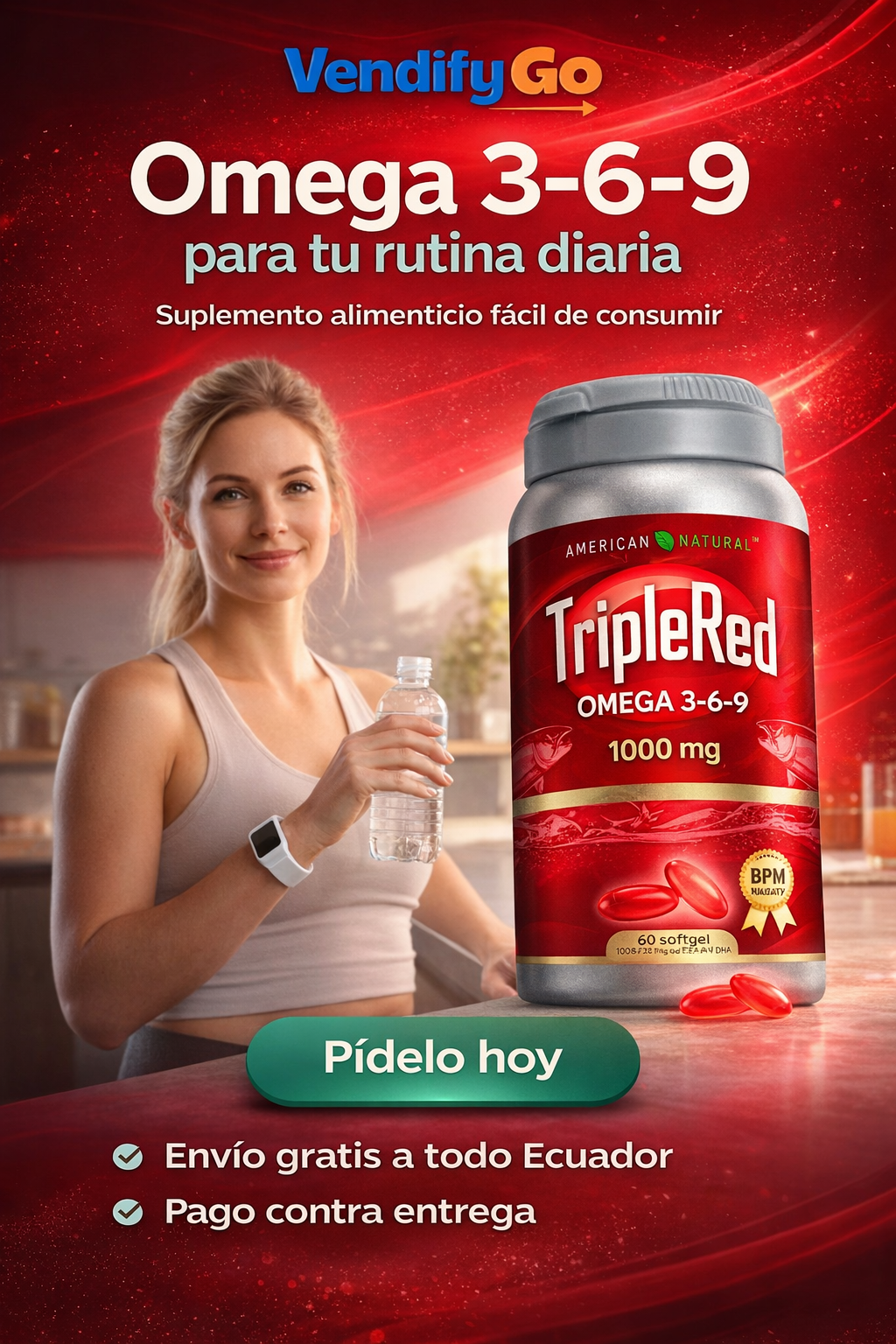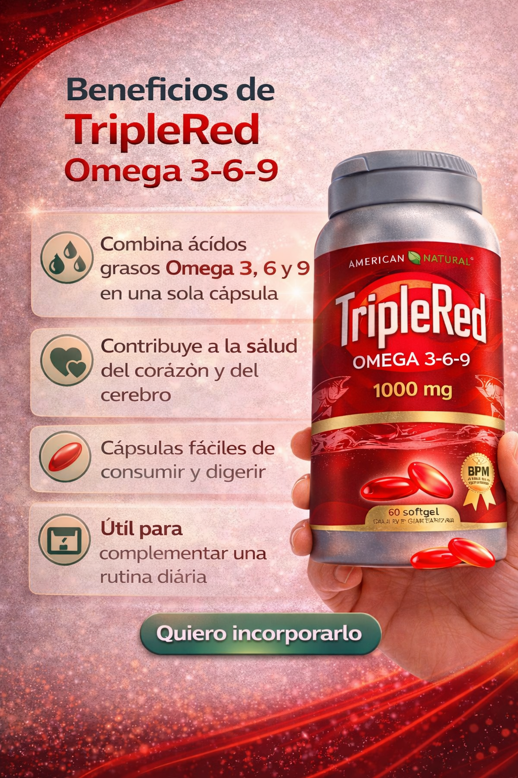 TripleRed Omega 3-6-9 aporta ácidos grasos esenciales que el cuerpo no produce por sí solo 🧬. Al consumirlo diariamente, ayuda a complementar tu alimentación y apoya funciones clave como el bienestar cardiovascular, cerebral y articular ❤️🧠. Su fórmula balanceada se absorbe fácilmente y actúa como apoyo nutricional para el cuidado diario del cuerpo 💊✨.